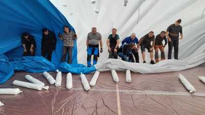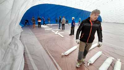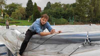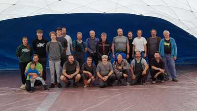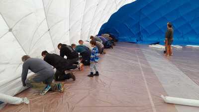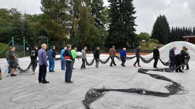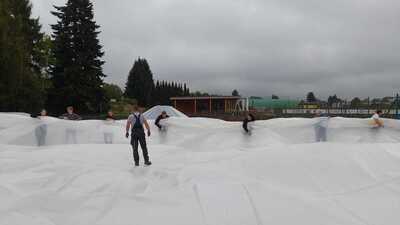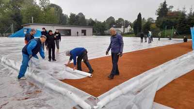 Montáž přetlakové haly pro druhou zimní sezonu proběhla v pátek 13. října. Smolné datum nám přineslo štěstí, protože po celou dobu montáže panovalo příjemné počasí. S instalací pod vedením odborníka z dodavatelské firmy pomáhalo 24 členů tenisového oddílu, začalo se (po dvoudenní přípravě) v 8 hod. ráno a skončilo v 15 hod., čímž jsme byli o 1,5 hod. rychlejší než v loňské sezoně. Topení bylo zprovozněno v úterý 17. října.