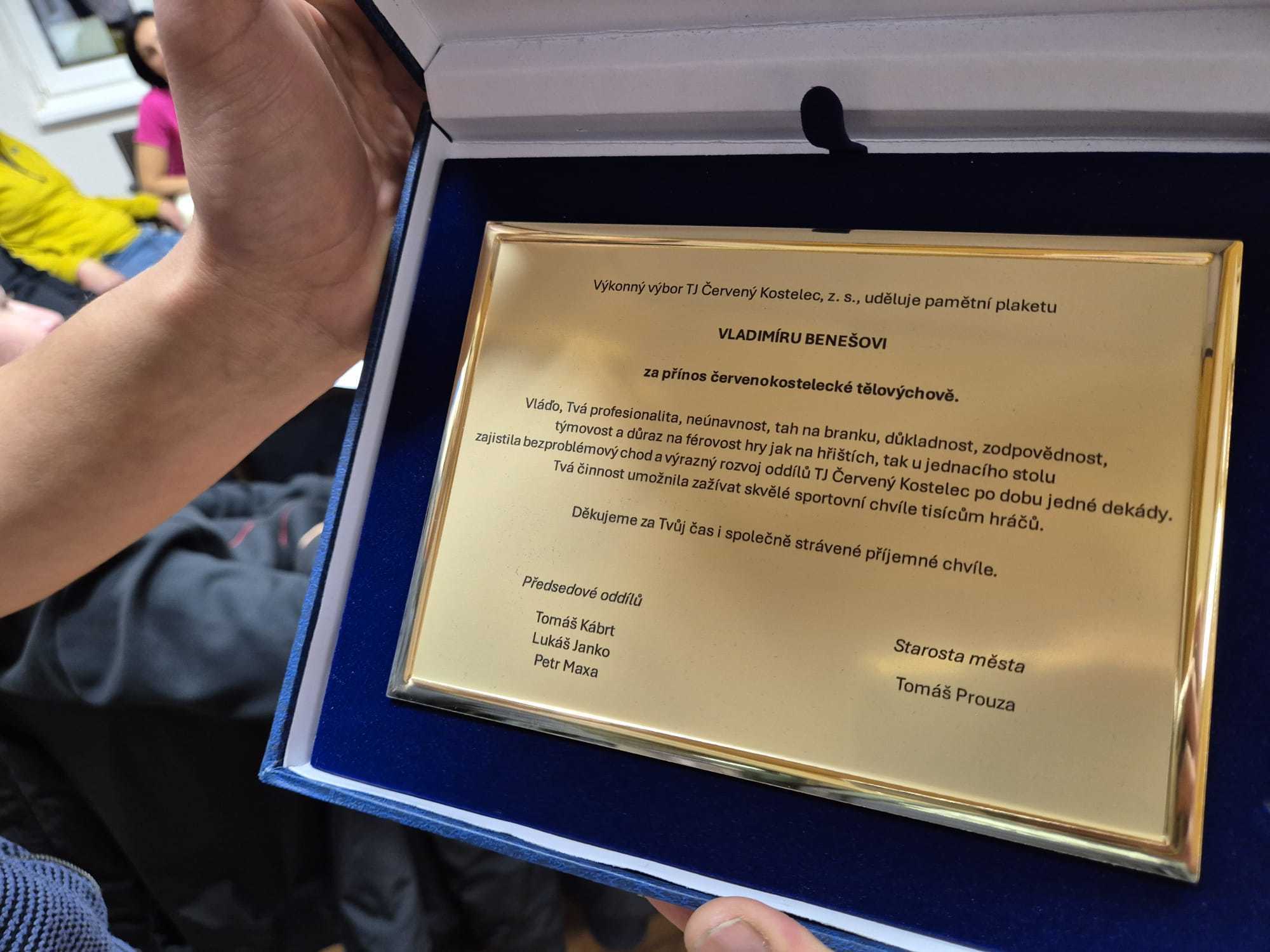 Druhým oceněným byl odcházející předseda TJ Vladimír Beneš, který pro TJ pracoval bez nároku na odměnu více jak jednu dekádu. I on dostal pamětní plaketu, konkrétně za přínos červenokostelecké tělovýchově. Věnování na plaketě si cenilo předsedovy profesionality, neúnavnosti, tahu na branku, důkladnosti, zodpovědnosti, týmovosti a důrazu na férovost hry jak na hřištích, tak u jednacího stolu. Jeho práce zajistila bezproblémový chod a výrazný rozvoj oddílů TJ Červený Kostelec po dobu jedné dekády a umožnila zažívat skvělé sportovní chvíle tisícům hráčů.